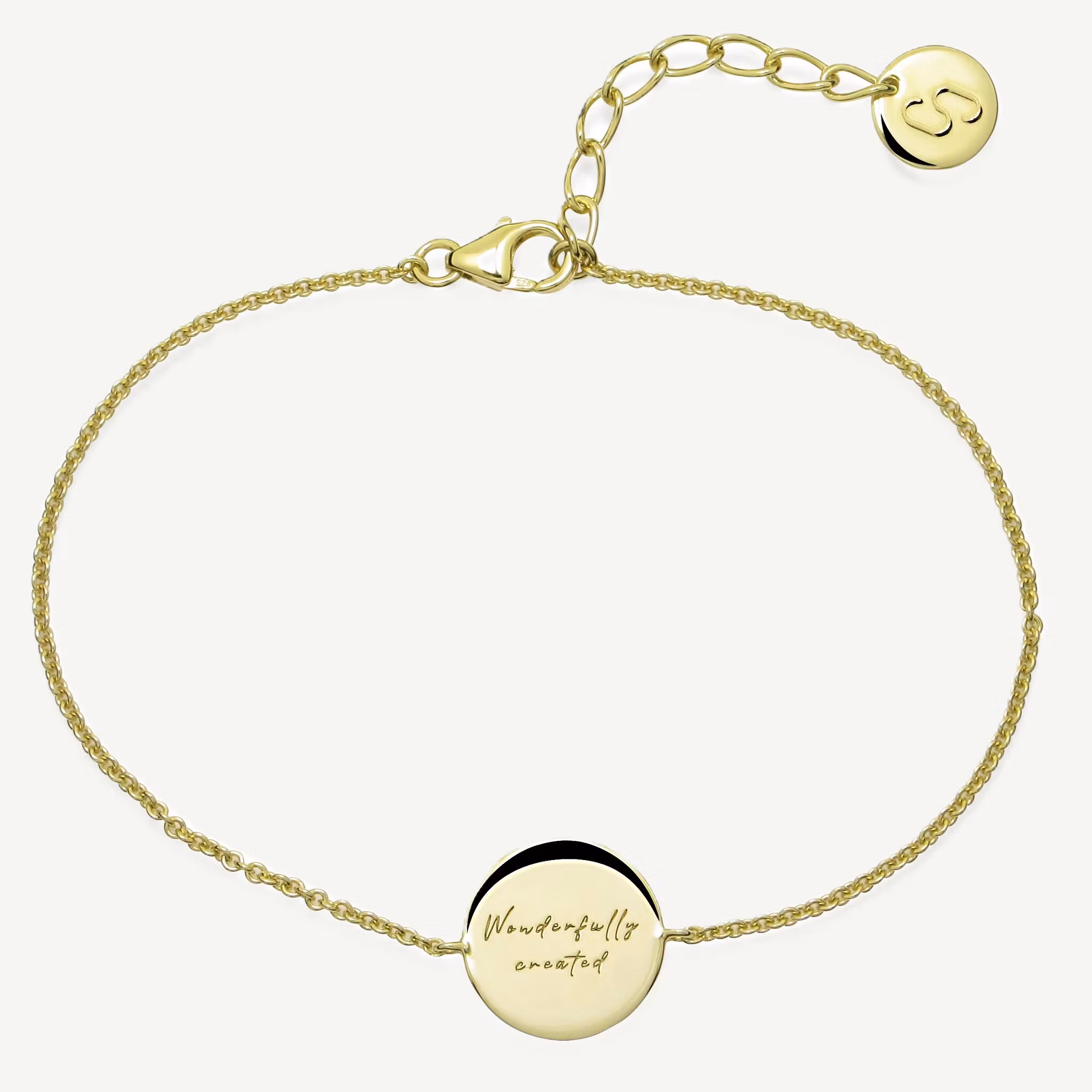 Vackert armband med texten Wonderfully Created subtilt ingjutet som en daglig påminnelse.