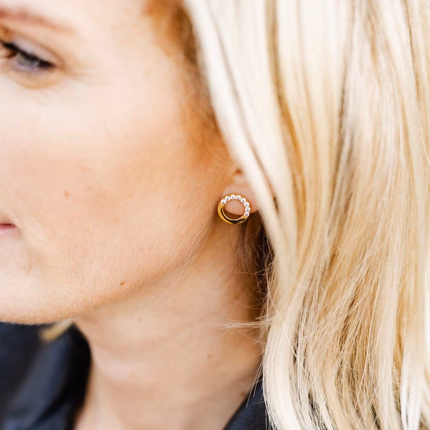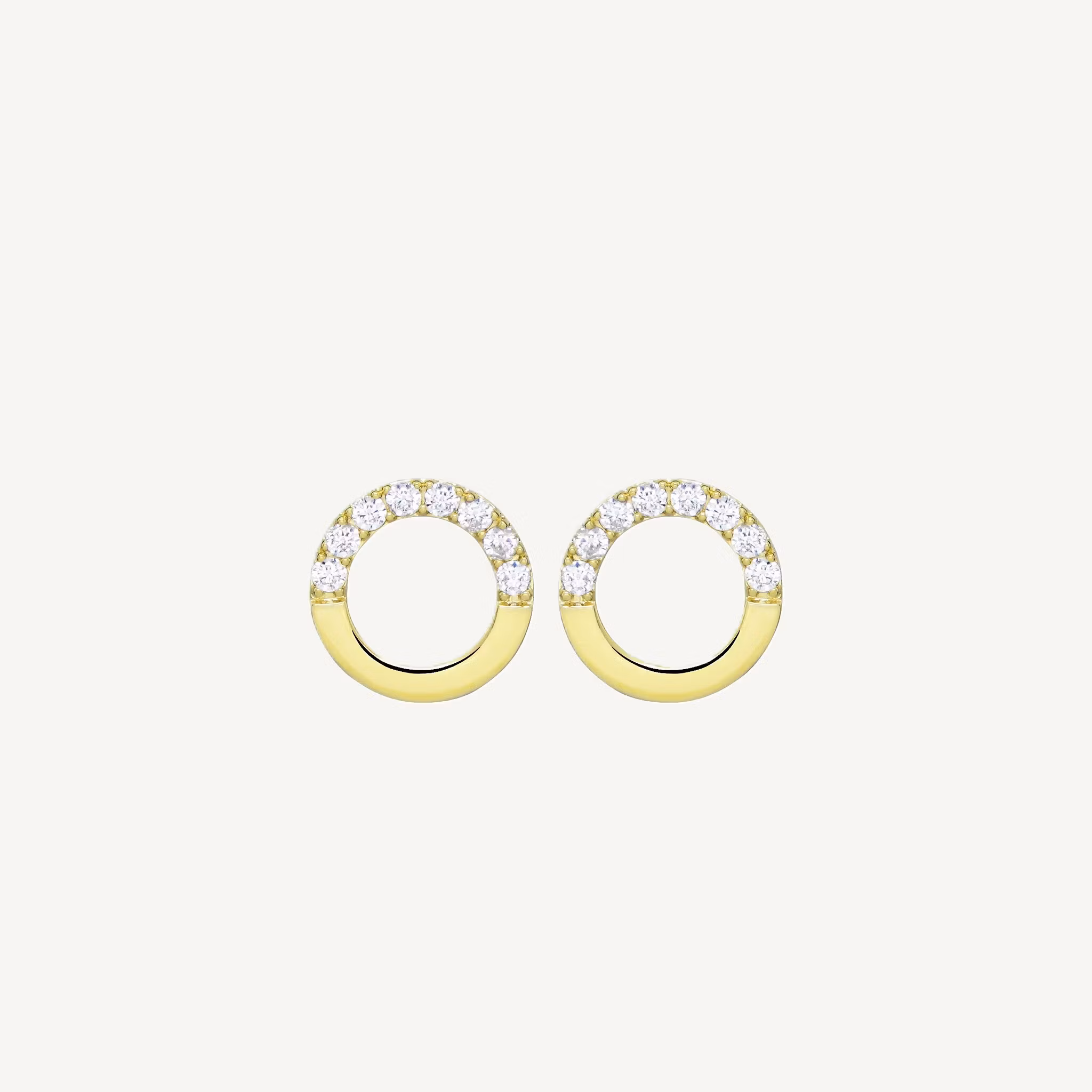 Örhängen av återvunnet silver med 18K gedigen guldplätering (2 mikron!) för att behålla färgen under lång tid. Gnistrande Cubic Zirconia-stenar. Stiftörhängen som fästs med tillhörande vinglås. Levereras i en fin FSC-märkt smyckesask.