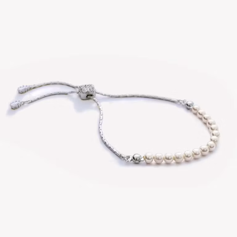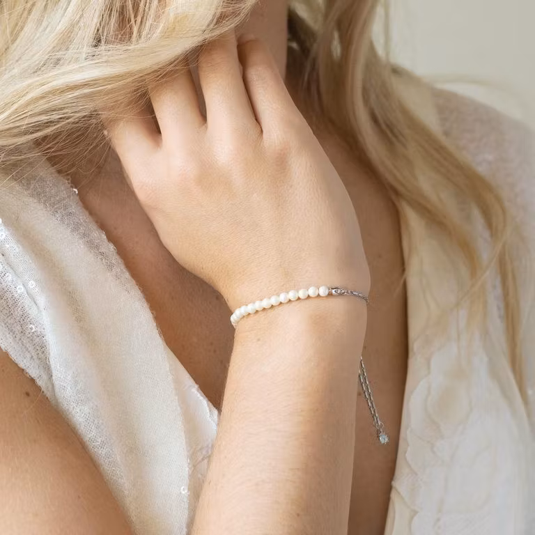 Nätt pärlarmband i klassisk design med modern twist. Justerbar knäppning som glider längs kedjan för att ge en bekväm passform oavsett storlek på handled.