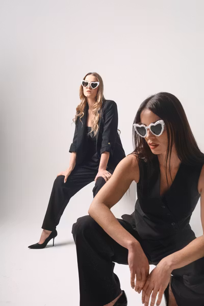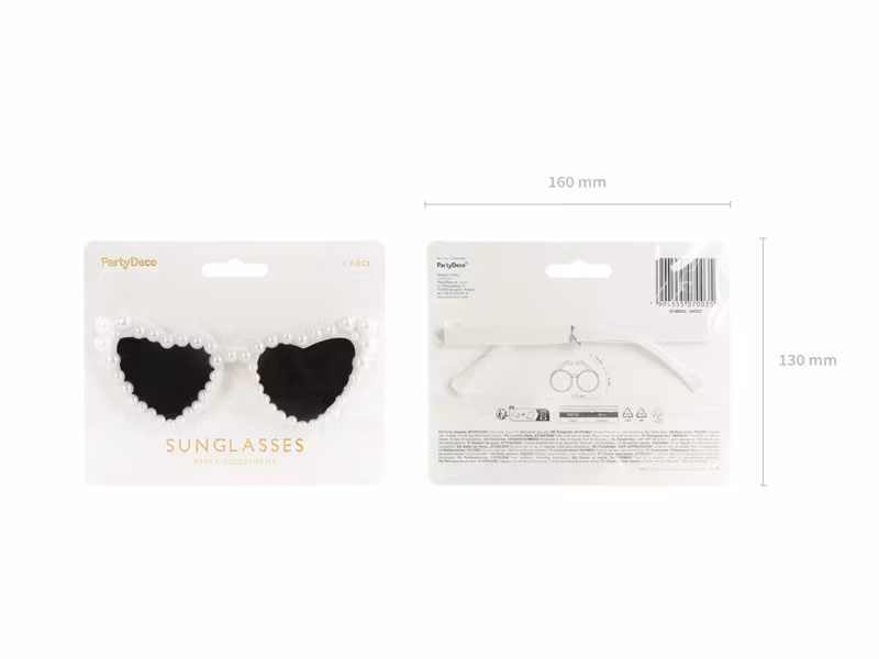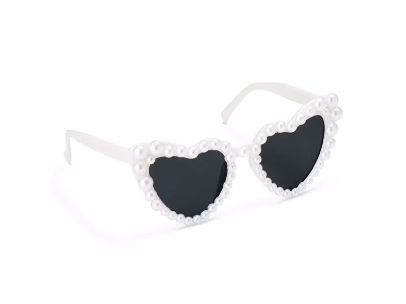 Hjärtformade glasögon - vita bågar med svarta linser dekorerade med vita pärlemorfärgade pärlor.