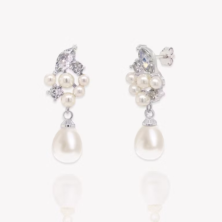 Örhängen i mässing med rodiumplätering (tillhör platinafamiljen) för högre skydd mot oxidation. Fasettslipade Zirkoniumoxidkristaller (trippel A-klassade) och syntetiska pärlor med naturlig pärlemorlyster. Levereras i en lyxig smyckesask.
