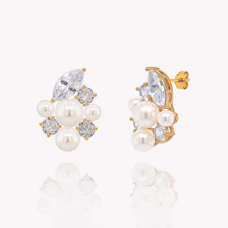 Örhängen i mässing med 14K guldplätering. Fasettslipade Zirkoniumoxidkristaller (trippel A-klassade) och syntetiska pärlor med naturlig pärlemorlyster. Levereras i en lyxig smyckesask.