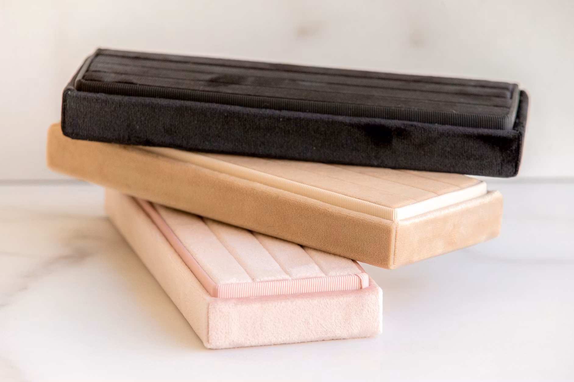 Handgjord ring- och smyckesförvaring i mjuk sammet. Den öppna ringasken har tre rader med plats för ringar, örhängen mm. Totalt finns plats för så mycket som 24 ringar eller par av mindre örhängen.