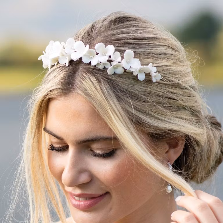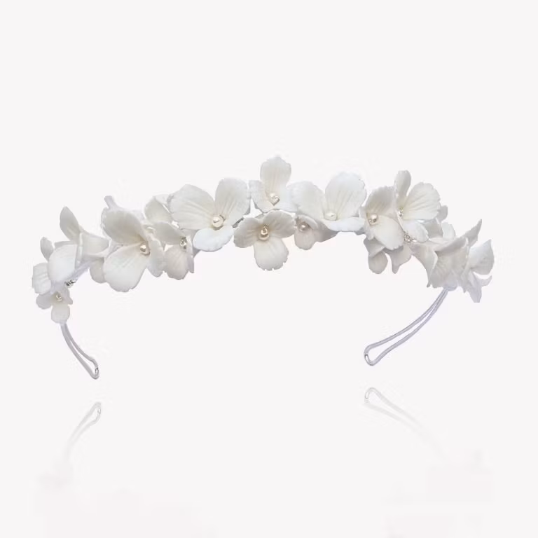 Romantisk tiara med handgjorda keramiska blommor och elfenbensfärgade pärlor i högsta kvalité.