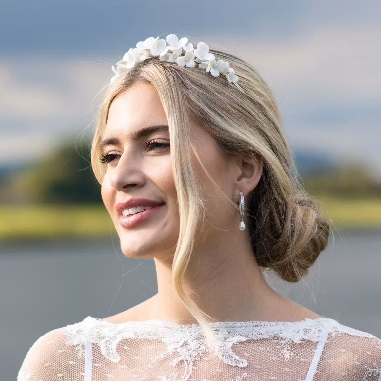 Tiara med härdade keramiska blommor och konstgjorda pärlor av glas med naturlig pärlemolyster. Mässing pläterad i äkta silver. Produkten kommer vackert förpackad i en lyxig box.